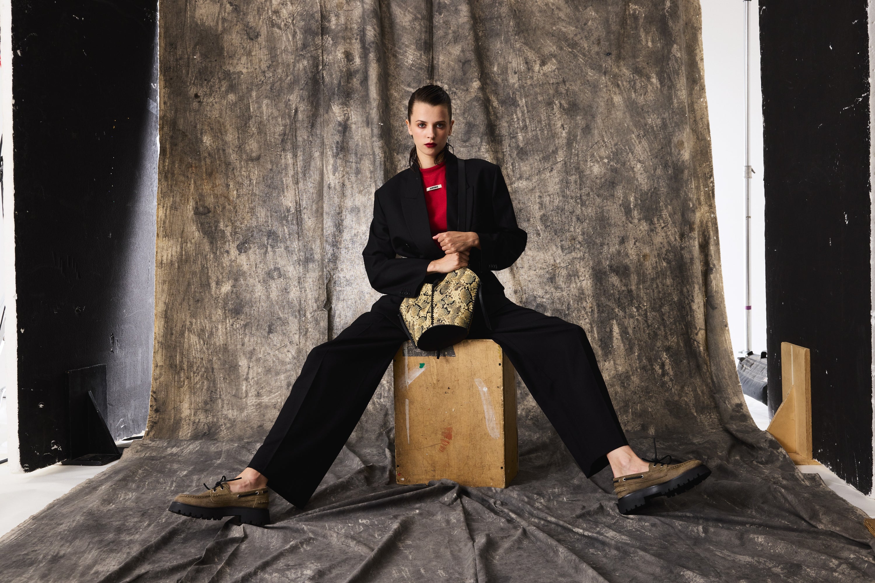 Chi preferisce un approccio più minimale può ispirarsi al “Black Minimal Style”. La maglia rossa di Jacquemus illumina il look e si abbina alla perfezione con la Giacca e i Pantaloni di Victoria Beckham, che donano una struttura impeccabile. La borsa pitonata di Isabel Marant, il mocassino di Alexander Wang e la cintura di Golden Goose definiscono un outfit dal carattere essenziale ma dall’eleganza forte.