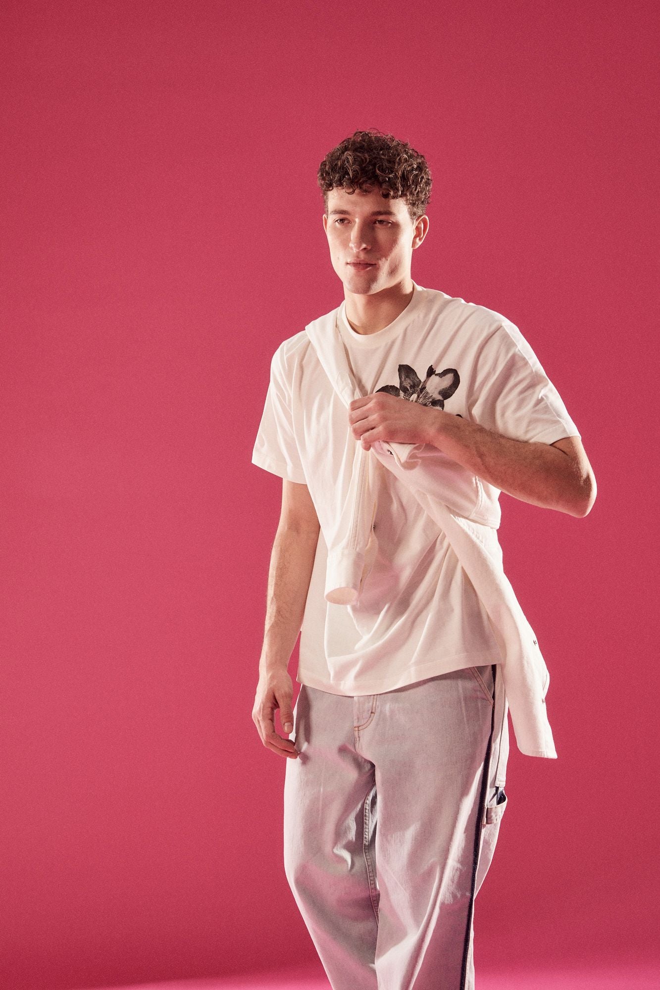 The white jeans by Versace bring a breath of fresh air to the look, balancing the bold prints of the shirt and the bright color of the T-shirt. White is synonymous with timeless elegance and fits perfectly with the summer season.