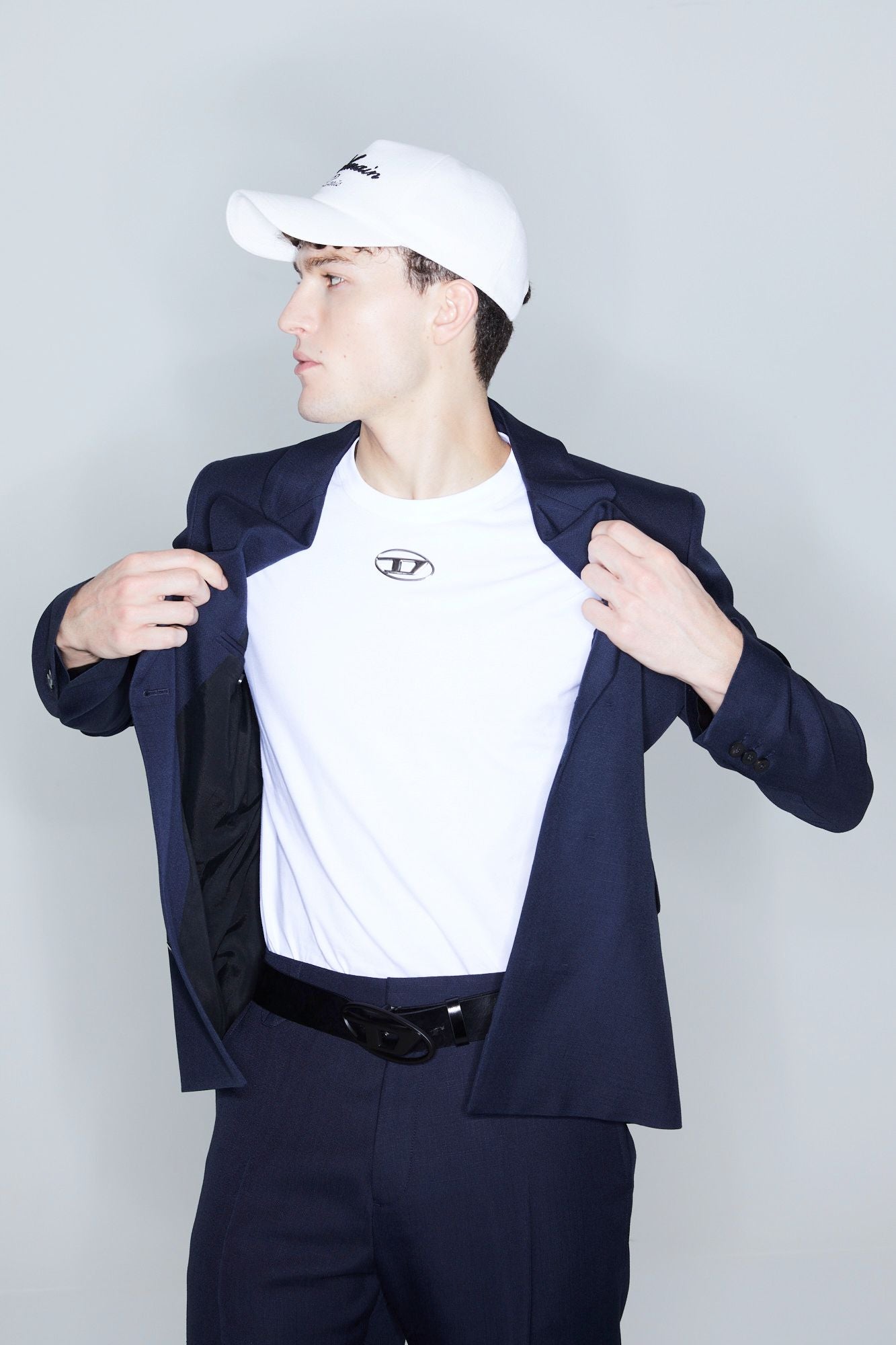 And let’s not forget your companion: a gentleman, always impeccable, in a navy blue suit composed of jacket and trousers by the French fashion prodigy Jacquemus, paired with a slim white Diesel t-shirt and a Balmain Paris baseball cap. Finish the look with sporty, eye-catching ankle boots by Alexander McQueen to complete the outfit with a masculine touch of class.