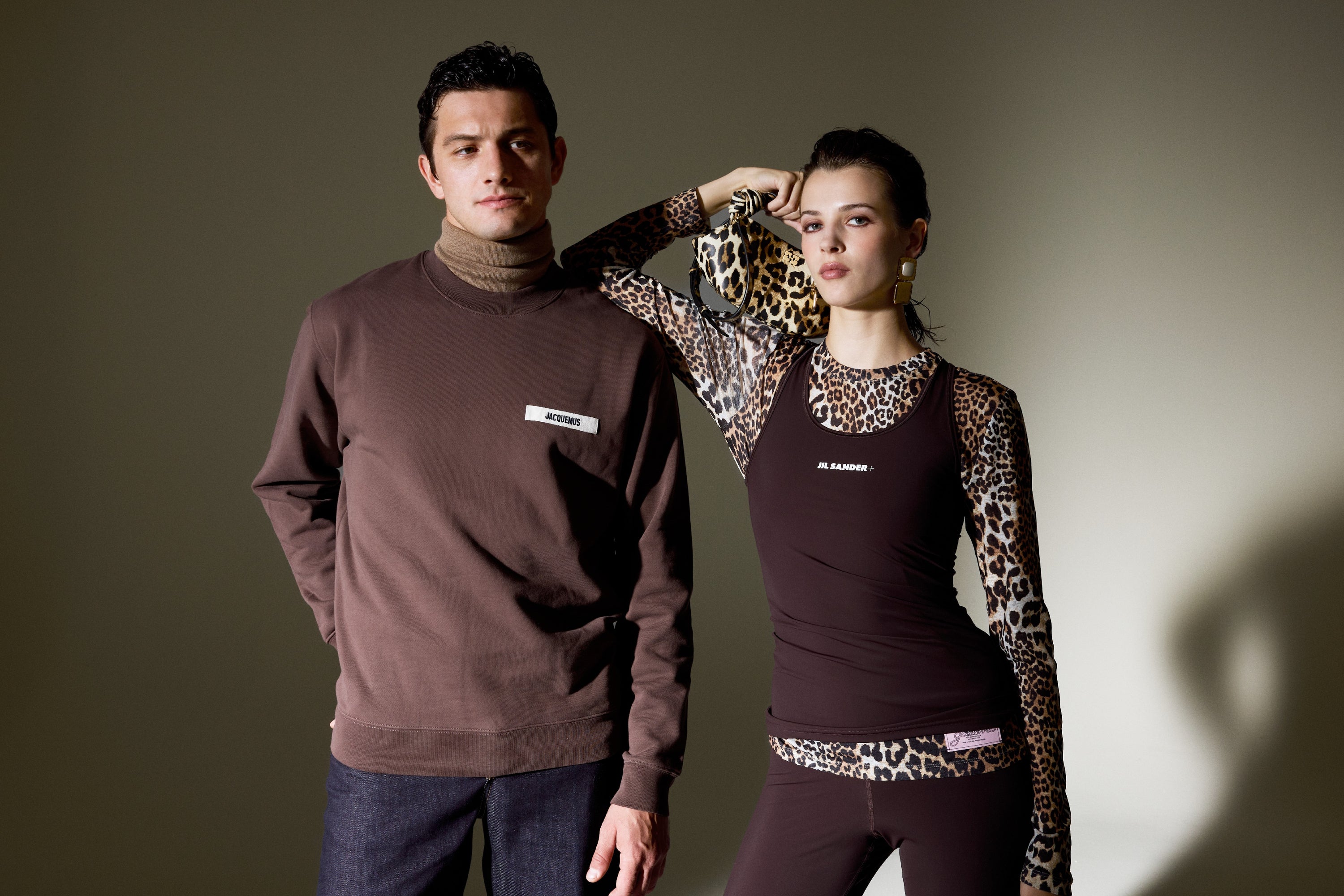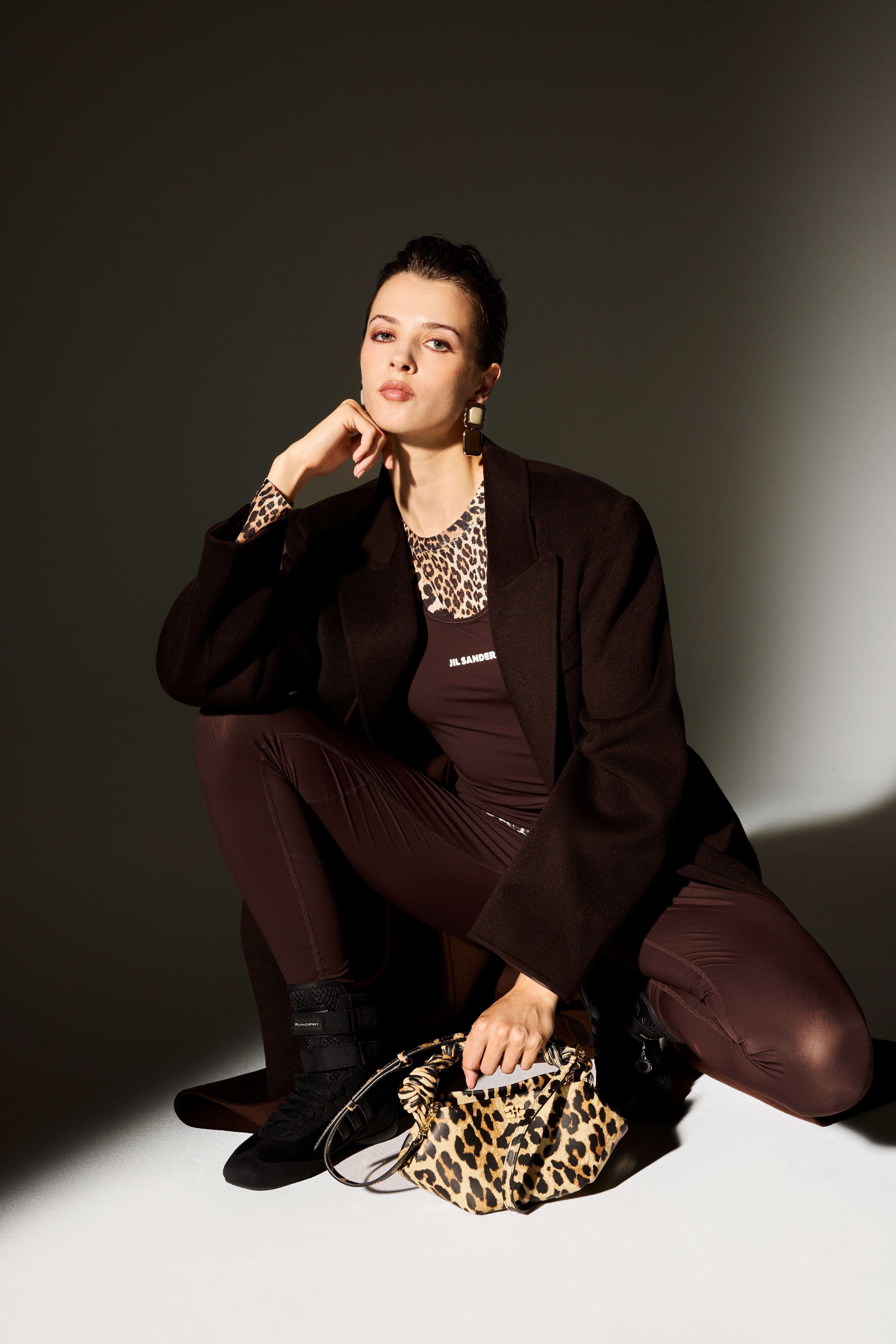For her, you can opt for a leopard-print bag by Ganni, adding a wild touch to both relaxed and sophisticated looks. Jil Sander’s brown stretch leggings are ideal for moments when you want to feel comfortable yet polished, while the brown stretch top by Jil Sander completes the set with subtle harmony. Self-Portrait earrings bring light and femininity even to the softest outfits, and the Adidas by Stella McCartney sneaker-boot blends sustainability, performance and contemporary design. Finally, Ganni’s long-sleeved leopard-print top reinvents animalier in a chic and versatile way.