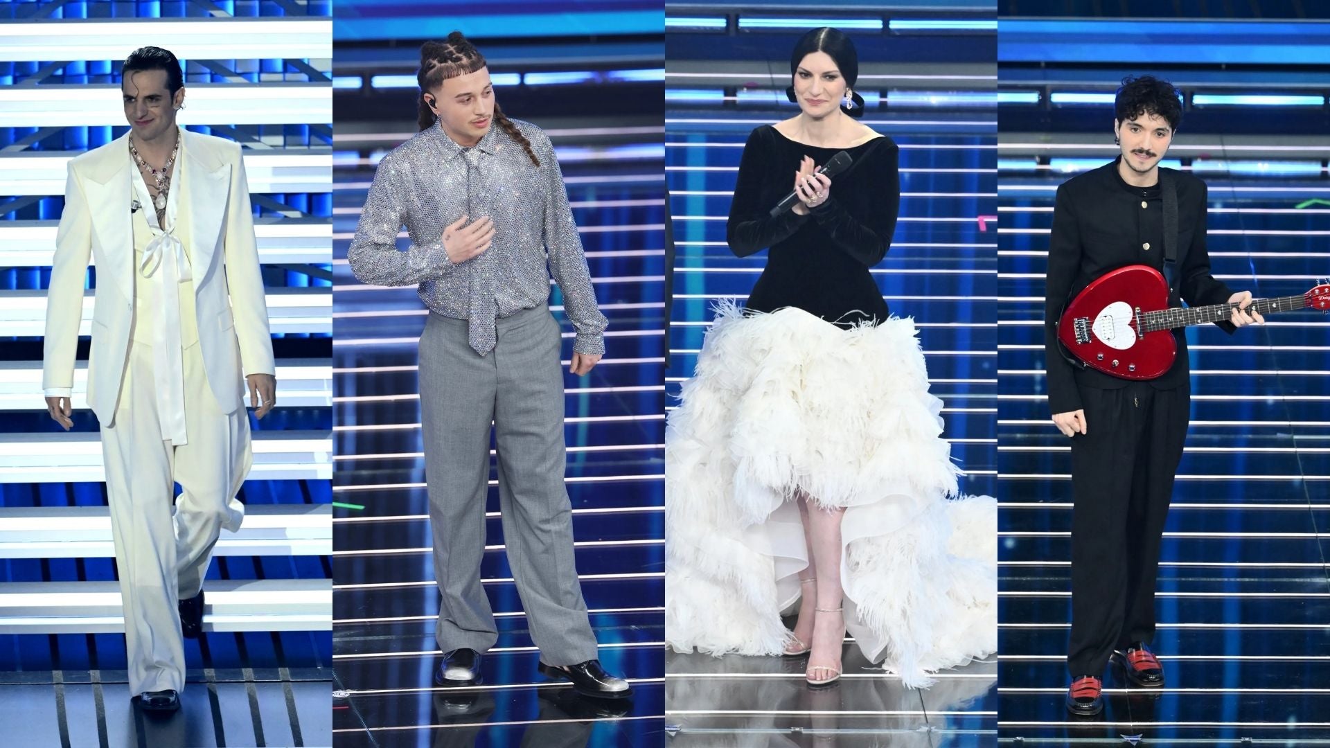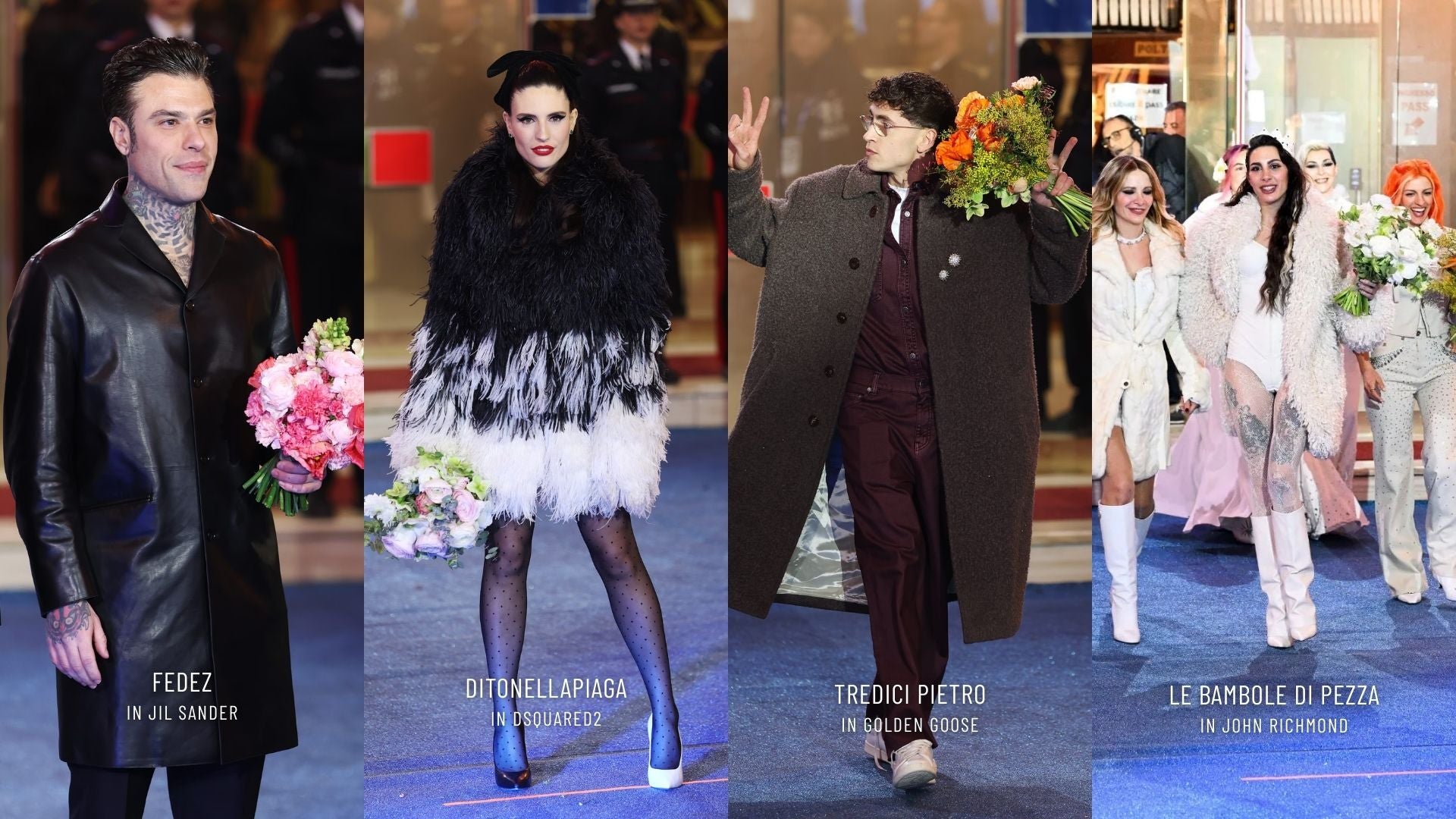 Da sinistra: Fedez in Jil Sander | Ditonellapiaga in Dsquared2 | Tredici Pietro in Golden Goose | Le Bambole di pezza in John Richmond