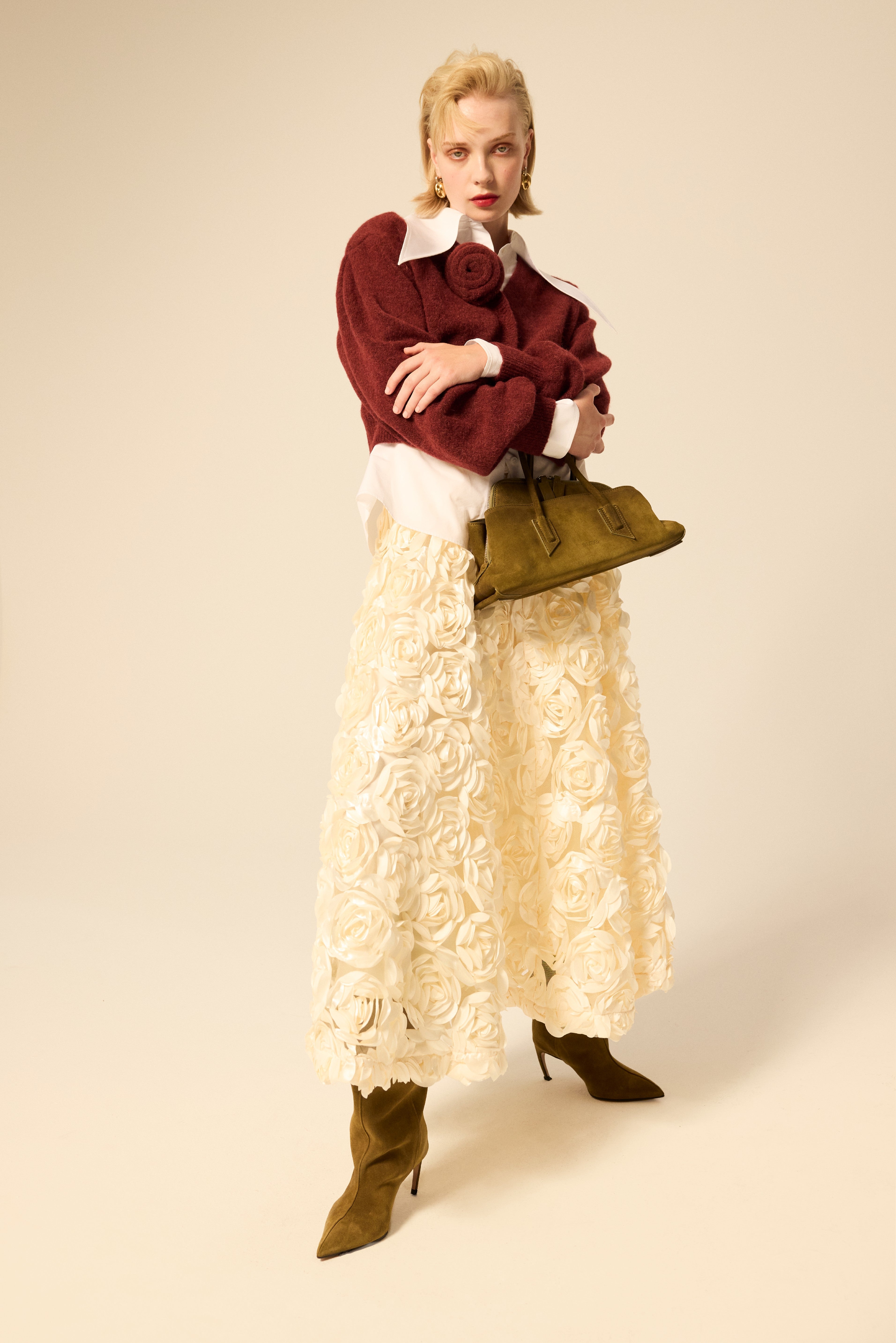 Lo stile vintage donna della FW25 punta su capi iconici e accessori unici. La borsa scamosciata e gli stivali scamosciati verdi di The Attico completano un look vintage elegante, mentre il cardigan di lana color bordeaux e la gonna ricamata con rose color burro di Rotate aggiungono un tocco romantico e femminile. La camicia con colletto gotico di Alexander McQueen, abbinata a orecchini Rabanne, definisce uno stile retro donna sofisticato. Questi outfit mostrano come lo stile vintage abbigliamento possa essere reinterpretato con creatività e personalità.